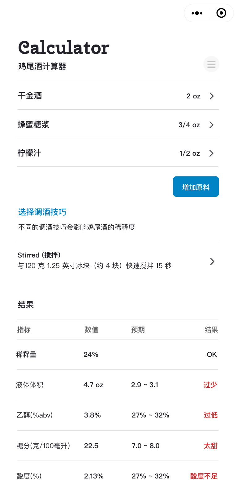 cocktail chemistry 的计算器其实非常棒,它可以直观的告诉你的鸡尾酒是否可能不足。